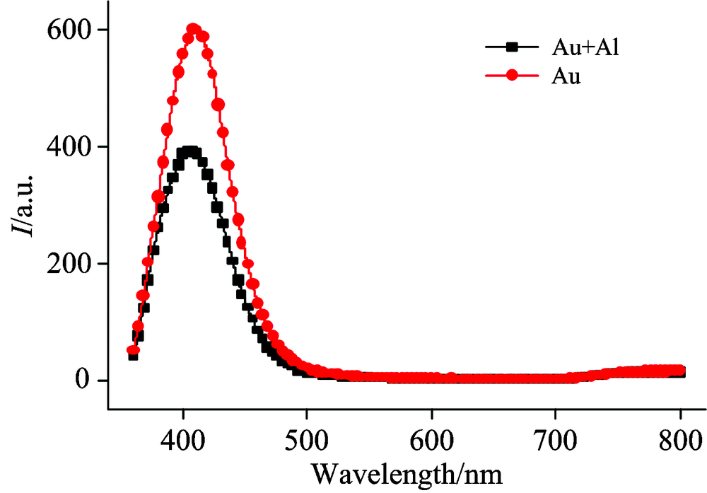 由图3可知, 以Au为金属催化剂制备的Si纳米线在Ce掺杂后有着更高的发光强度。 分析认为, Si纳米线的密度较大时, 纳米线交错堆叠在一定程度上会阻碍CeO2和纳米线的接触, 减小了Si纳米线中Ce3+数量, 故发光强度降低。
