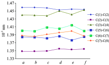Fig.3 lists the selected bond angle information of these compounds. It is shown that the variation of bond angle ∠C(6)C(7)C(8) is greater than others, and it in compound-b and -f becomes larger, while it in compound-c and -e becomes smaller, but for bond angles on the ortho ∠C(7)C(8)C(9), the situation is reversed. We think the reason is that different substituents in compounds have different repulsive force to the ortho carbon atom. From Fig.3, it is also shown that the bond angles ∠C(2)C(1)O(-) did not change significantly.