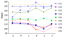 As shown in Fig.1, the compound-a is a coumarin molecule that has no substituents on the ring, while the compound-b~f are all coumarin derivative and have different substituents on C(3) or C(7).In order to be more intuitive to show the different effects of different substituents on C(3) and C(7) on the chemical shift of each compound, we draw the graph of Fig.4. From Fig.4, it is shown that different Substituents and different positions of substituents all have different influence on NMR of the several coumarin derivatives. Compared with compound-a, the largest change of chemical shift in compound-b~f was C(7), followed by C(3), C(6) and C(8), and the smallest change in chemical shift is C(1), C(5) and C(9). In general, after the hydrogen atom on the benzene ring is substituted by other groups, the δ value of the α -C(C(7)) atom next to the substituent changes obviously; the δ value of the ortho carbon atoms [C(6) and C(8)] have a great change too; the δ value of the meta carbon [C(5) and C(9)] atom have almost no change. In compound-d and f, the oxygen atom is directly connected with the benzene ring. Due to oxygen strong electron withdrawing, the α -C electron cloud density is reduced to the shielding effect, resonance bias low field, the chemical shift value increases. In compound-b, the substituent of -Br on C(7) is electron withdrawing group, with strong electron withdrawing, so the electronic cloud density of carbon atom is [C(7)] directly connected with the substituent reduced. The shielding effect is weaken, the chemical shift is biased to low field and theδ value increased. However, due to the heavy atom effect, with respect to the substitution of -Cl and -F, the substitution of -Br will produce a high field shift for the resonance of α -C. This is why the chemical shift of C(7) is bigger but not too much. In compound-e, the substitution of amino group is the reason for the chemical shift of C(7). Amino is ortho para directing group, and mesomeric effect made resonance of ortho carbon atom on benzene shift to high field. Therefore, the chemical shift values of C(6) and C(8) are significantly smaller in the compound-e.Substituents on C(3) are alkyl groups. Substituted alkyl groups make chemical shifts of the substituted carbon atom corresponding increase and due to the influence of the space effect, the larger the alkyl group, the more branches, the greater the chemical shift value of the substituted carbon atom. The electron withdrawing of the carbonyl oxygen atom makes the carbonyl carbon atom in the electron deficient state, so the resonance is in the low field. But when the carbonyl group is connected with the impurity atom or the unsaturated group, the electron shortage of the carbonyl carbon atom can be relieved by the conjugated effect or the inducing effect, resonance is biased to high field and the δ value decreased.