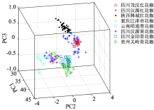 在全光谱波长范围内, 对8个产地的花椒样品近红外光谱进行主成分分析, 最佳主成分数为19, 图2反映的是整个花椒样品集中样品点在PC1, PC2及PC3上的聚类, 前3个主成分的方差贡献率分别为92.17%, 4.64%和1.81%, 累计方差贡献率达到98.62%, 故样品在该平面上的投影分布可以充分表征样品在多维空间中的分布特征。 从图2中也可以看出, 对8个产地的样品光谱数据进行主成分分析, 基本可以分开, 在一定程度上反映了与样品品种、 产地相关的信息和特征。 3个红花椒和5个青花椒在距离上明显分开, 说明品种相同其内部品质的差异更小; 四川汉源红花椒和四川茂汶红花椒相距更近, 甚至有重叠, 部分重叠的情况也出现在重庆江津青花椒和四川汉源青花椒的分布上, 这可能是由于地理位置、 气候、 土壤等因素较接近引起。 因此, 仅使用主成分分析不能完全将产地识别, 故在主成分分析的基础上, 还需采用有监督的模式识别方法进行定性分析。