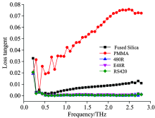 从图3中可以看出, 各个样品随频率升高所呈现的介电常数变化有不同的趋势。 熔融石英的介电常数随频率升高, 但PMMA随频率降低, 显示出异常的色散特性。 不同型号的COP因为所含添加剂的原因, 其介电常数略有不同, 但在三种材料中最低, 维持在2.3左右, 即使在高频范围内也几乎没有变化。 如图4所示, 在介电损耗角正切上, PMMA表现出最强的损耗, 损耗角正切达到0.02, 而在高频部分可以达到0.07。 熔融石英也显示出随着频率上升的趋势, 在高频段接近0.01。 COP与其他介电材料相比, 在整个实验波段中维持10-4的低损耗角正切值。一般认为所观察到的太赫兹吸收是由于光辐射与声子的无序激发相互作用引起的[18]。 对于PMMA的介电特性, 已有文献表明在2.3 THz出现的异常色散特性是由于玻璃态振动特性引起的玻色峰[17]。 玻色峰是非晶态的本征特征, 它与相对过剩的振动模相关。 同时电介质内部分子的交替极化和晶格碰撞引起的能量耗散, 也造成了吸收。 可以确定的是, 太赫兹脉冲穿过COP材料时, 能量耗散较低, 将其作为传输线介电基底时能减少介电损耗。 并由于其较低的介电常数, 对辐射损耗也有一定程度的减弱。