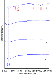 不同浓度油酸钠作用后胶磷矿的透射红外光谱如图3所示。 可以看出, 当油酸钠浓度达到3.3× 10-2 mol· L-1时, 才能检测到表面吸附的油酸钠振动峰, 这是由于矿物本身对红外透射光有较强的吸收, 导致很难检测到矿物表面油酸钠微弱的红外吸收信号; 因此通常使用相对较高的药剂浓度, 往往高于实际浮选药剂浓度几个数量级[6], 这是采用透射红外光谱法研究表面的一个缺点。 检测到的油酸钠CH2振动峰仍然在2 920和2 851 cm-1, 但COO-振动峰由原来的单峰1 562 cm-1分裂为双峰1 575和1 539 cm-1, 这与油酸钙的特征吸收峰吻合。 通常认为形成了油酸钙沉淀沉积或吸附在胶磷矿表面[10], 这是因为胶磷矿属于半可溶盐类矿物, 容易溶出钙离子[15], 当油酸钠浓度较高, 在碱性条件下容易超过油酸钙溶度积生成沉淀。 Gong等[7]通过溶度积计算证明了这一点; Paiva等[16]通过原位原子力显微镜也证明了表面油酸钙沉淀的生成。 但由2.2节中结果可知, 在该油酸钠浓度下, 胶磷矿表面会残留较多油酸钠溶液, 会掩盖油酸钙吸收峰, 只表现出油酸钠吸收峰(图5f), 但现在却检测出油酸钙吸收峰(图3d), 推测可能是在晾干过程中残留油酸钠与矿物溶出钙离子反应生成了油酸钙沉淀。