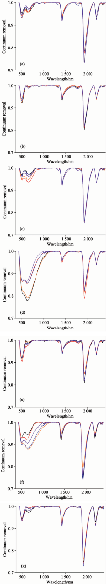 图2为不同土属反射光谱去包络线。 黑钙土的三个土属表现出三种反射光谱特征[图2(a), (b)和(c)], LCACH的第一个吸收谷深度一般在0.071, 第二个在0.057, 第一个吸收谷深度普遍大于第二个吸收谷深度; SCACH的第一个吸收谷比较对称而且较深, 第二个吸收谷特别小; SMCH前两个吸收谷的深度基本相同, 体现出“ W” 型特征。 图2(d)和(e)分别是LBS和SFMA, LBS和SFMA的反射光谱特征都只有一种变化趋势, LBS的前两个吸收谷特别深, 第一个吸收谷不太明显; SFMA的变化趋势与SCACH相似, 但SFMA的第一个吸收谷更对称, 对称度为0.5。 图2(f)和(g)是两种草甸土(SCAMS和SSMS), SCAMS有两种反射光谱特征, 这两种光谱特征分别和LCACH与LBS的反射光谱特征相似; SSMS的反射光谱特征与砂性土相似, 但第二个吸收谷更深一些, 第四个吸收谷明显比砂性土深。