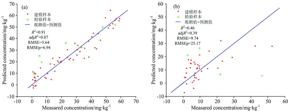土壤Cd含量全要素主成分逐步回归建模散点图结果如图3所示。 图3(a)表明, 类标准化Cd污染土壤样品Cd含量光谱反演模型精度为R2=0.91, adjR2=0.87, 模型构建与检验均方根误差RMSE分别为5.64和6.94; 且随着土壤Cd含量升高, 模型Cd含量预测值更接近于实际观测值, 预测精度逐步提升。 相比基于类标准化Cd污染土壤建模样品及检验样品散点紧密集中在1:1线附近, 自然污染土壤样品Cd含量反演模型[图3(b)]精度偏低(R2=0.46, adjR2=0.39), 误差偏大(RMSE=9.74, RMSEp=25.17)。 分析原因, 自然污染土壤样品因多种组分含量差异化混淆效应, 其光谱特征与本身含量低、 光谱响应信号不强的Cd含量的相关性往往容易被掩盖, 这也或许正是当前传统研究始终难以建立高精度土壤Cd含量高光谱反演模型的关键所在。