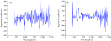 图4为土壤Cd含量全要素主成分逐步回归高光谱反演模型各波段回归系数。 分析图4(a)中类标准化土壤样品回归系数可知, 研究区土壤全波段光谱包括弱信号对土壤Cd含量变化均产生了不同程度的响应, 其中1 000, 2 000以及2 300 nm波段处光谱响应信号相对较强。 但就土壤Cd含量的光谱响应指示性特征波段提取而言, 并未发现相关系数显著高于其他波段的传统意义上的指示性波段。 这一结果说明对于土壤Cd含量的预测, 在指示性波段难以提取的前提下, 依赖全波段光谱共同响应特征或许是实现土壤Cd含量高光谱反演的一种择中手段。 与此同时, 基于自然污染样品的土壤Cd含量高光谱反演模型回归系数[图4(b)]表明, 与现有已报道的包括405与480 nm, 735与905 nm[15]等在内的特征波段相比, 本研究同样发现了被通常认为与铁锰氧化物或黏土矿物等有关的特征波段480和730 nm等[14]。 对照分析这一结果与上述图4(a)结果实际上可进一步间接揭示传统试图基于野外自然污染土壤样品建立土壤重金属含量高光谱反演模型的方法存在一定的理论缺陷, 并且在此过程中识别的特征波段存在较大的不确定性, 很可能对某一重金属含量的变化并无明确指示性作用。