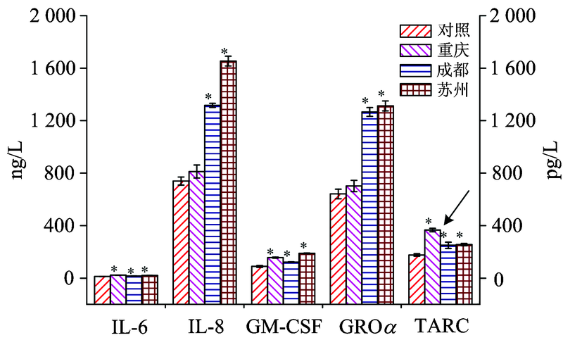 通过酶联免疫反应实验结果分析, 细胞在经过PM2.5暴露后会发炎, 从而产生多种细胞因子, 包括IL-6, IL-8, GM-CSF, GROα 和TARC等, 如图7所示。 经重庆、 成都和苏州地区PM2.5处理后的细胞, IL-6, IL-8, GM-CSF, GROα 和TARC的浓度都增加了; 苏州地区PM2.5促使细胞产生IL-6, IL-8, GM-CSF和GROα 的浓度是最高的, 重庆地区的PM2.5促使细胞产生TARC的浓度是最高的。 推测细胞被PM2.5处理后, 产生发炎损伤, 从而引起核转录因子NF-κ B活化, 导致细胞因子浓度增加[25]。 从整体来看, 经苏州地区PM2.5处理后的细胞, 产生细胞因子的浓度值之和是最高的, 因此可以推断, 苏州地区PM2.5的毒性可能比其他地区略强一些, 和拉曼光谱仪、 AFM测定的生物光学信息、 力学参数的改变程度相一致。