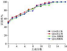 最后采用了线性判别和二次判别方法分别对细胞进行分类识别, 基于两种判别方法, 其识别率随主成分数的增加而逐渐趋于100%, 如图4所示。 采用线性判别分析时, 当主成分数为16时, 校正集和预测集识别率均达到100%; 采用二次判别分析时, 当主成分数为14时, 校正集和预测集识别率均达到100%。 由此可以看出, 采用二次判别方法, 能够更有效地对细胞进行分类识别。 线性判别决策面是一条直线、 一个平面或一个线性超平面; 二次判别决策面是一个二次曲面。 在预测协方差矩阵参数时, 二次判别需要的参数更多, 二次判别的适用范围更广, 因此在样本数量较多时, 二次判别比线性判别的效果更好。 两个识别模型均能够将对照组和3个实验组细胞100%的成功区分开, 说明细胞经过3个地区的PM2.5处理后, 分别发生了各异的生物化学成分的改变。