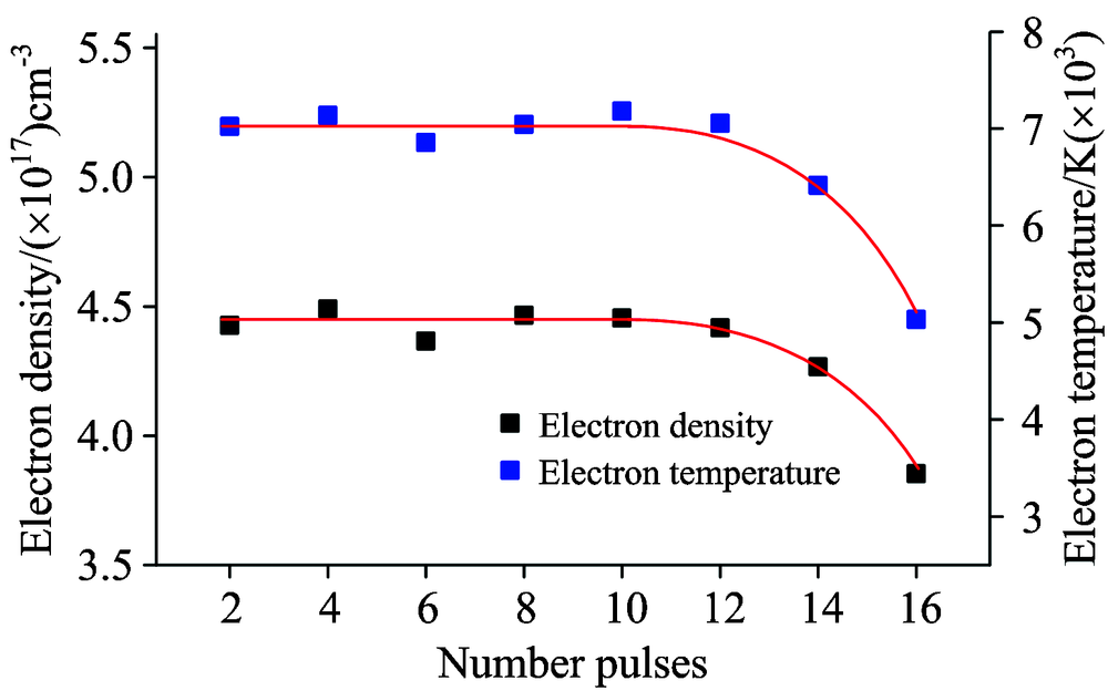 依据图2中不同激光脉冲作用后的等离子体光谱图, 我们选取Ti元素在375.9 nm处的特征峰来计算等离子体的电子密度。 选取Ti元素在375.9和428.7 nm的特征峰来计算等离子体的电子温度。 计算结果如图4所示, 从图中可以看出电子密度在前12个激光脉冲作用后, 无明显变化, 在14和16个脉冲作用时, 电子密度呈现明显的下降趋势, 等离子体电子密度从4.48× 1017 cm-3下降到3.85× 1017 cm-3。 随着激光脉冲的增加, 等离子体的电子温度变化趋势与电子密度相似, 等离子体电子温度从7.02× 103 K下降到5.03× 103 K。 这表明随着激光脉冲增加, 金属基板逐渐裸露, 激光辐照油漆面积减少, 油漆等离子体密度和温度逐渐减小。