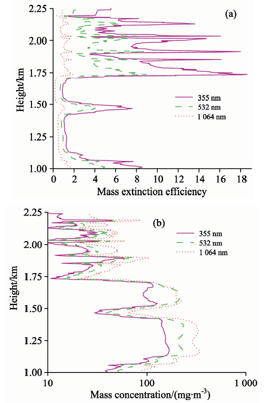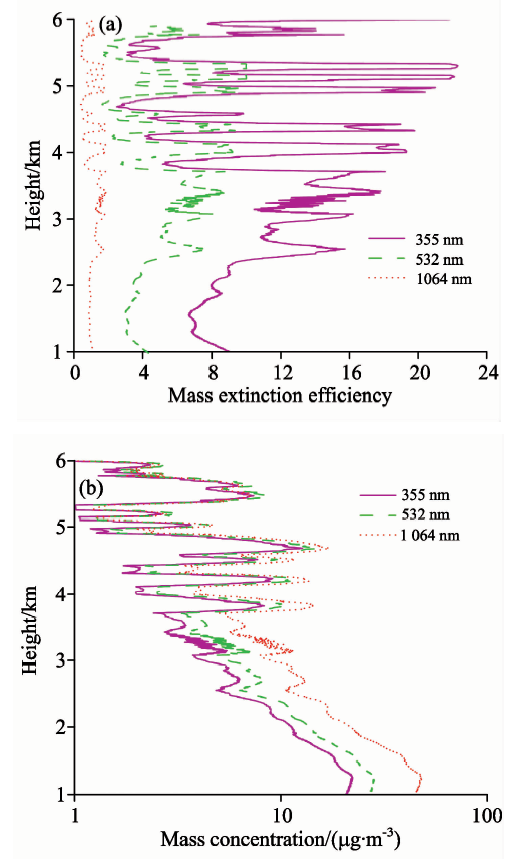 根据式(13), 计算得到355, 532和1 064 nm三个波段的颗粒物质量消光效率随高度变化曲线, 结果如图6(a)所示; 三波段的质量消光效率变化趋势较为一致, 然而, 355 nm波段的质量消光效率曲线随高度变化出现很大波动。 这主要由于气溶胶粒子的散射信号大小依赖于发射激光波长, 且粒子的半径与激光波长相当时散射最强, 355 nm的质量消光效率受占大比重的小粒子影响所致。