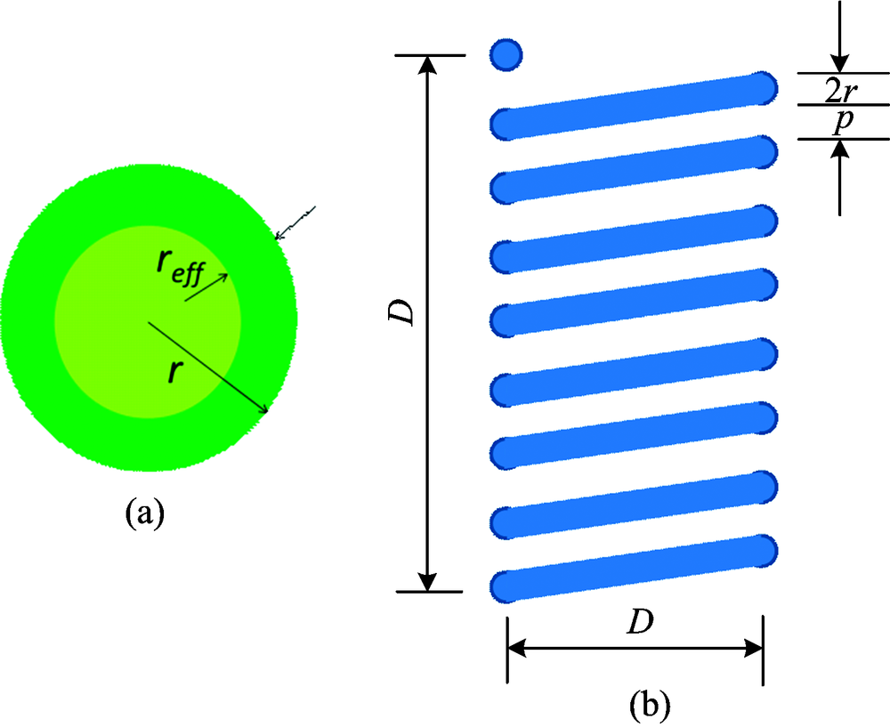 图2(b)为螺线管几何参数示意图, 螺线管线圈直径为D, 匝间距p, 其中取p=2r。
