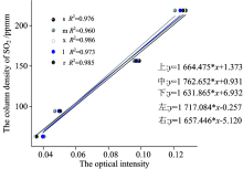 自从2006年首次使用传统的、 非色散的SO2相机对火山辐射测量以来, 成像系统的技术已经取得了巨大进步。 2013年Christoph Kern等[12]用7套相机对意大利斯特隆博利岛火山进行测量, 成功获取了有关SO2的测量。 1986年McElhoe等[8]使用便携式紫外敏感摄像机成功测量了12个工业栈释放的SO2。 2009年Prata等[8, 9]用紫外成像相机对驶入港口的船只辐射进行了测量, 成功获取了SO2的柱浓度与辐射量, 测量结果与DOAS和激光雷达吻合。 这些应用已经成功驱动了SO2相机的发展, 随着技术方法的不断成熟, 将来有望更好的确定痕量气体通量和其变化。 然而在我国开展SO2相机的研究应用较少, 本文详细阐述了SO2相机解析目标气体柱浓度的方法, 仔细分析了SO2相机的线性响应与灵敏性, 给出了测量的检测限, 并成功解析出SO2在空间的二维成像分布。