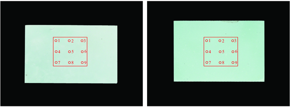 测试之前将每个样品在相同的光源条件下进行拍照, 在每个样品的照片上选择一个表面相对洁净, 大小为5 mm× 5 mm的区域, 按图1的方式选择9个点作为LA-ICP-MS的待测点位。 这样测试的方式主要目的有两点: (1) 评价样品的均匀性; (2) 提高样品的XRF工作区域数据的准确性。 通过红外光谱仪和激光拉曼光谱仪测试确定所有样品的待测区域为绿松石。