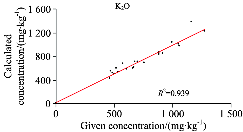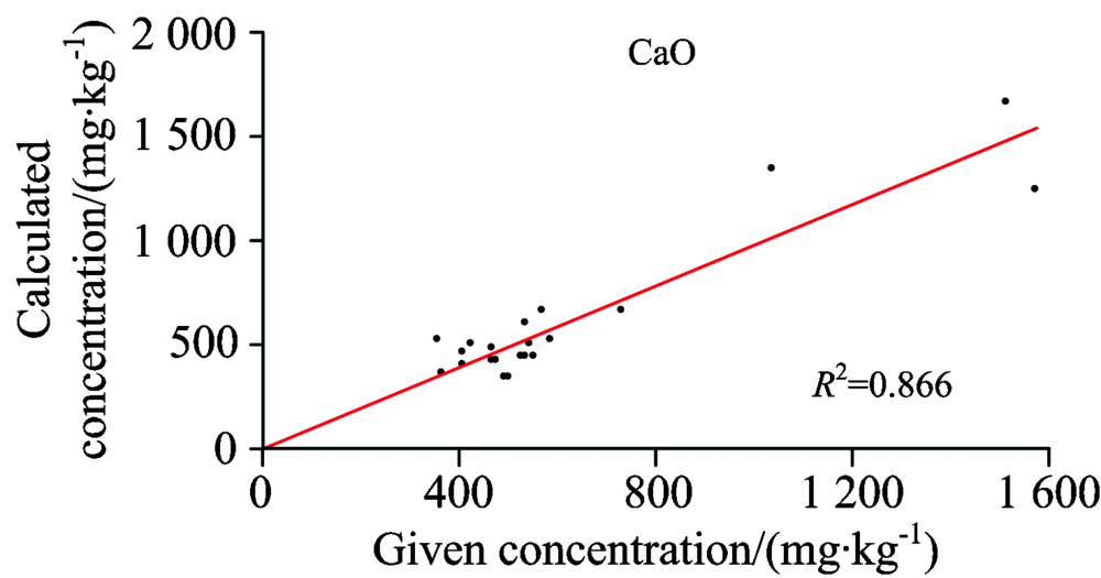 绿松石各分析元素的工作曲线如图2— 图11所示, Al, P, Cu, K, Si和V元素工作曲线的相关系数在0.923~0.972之间, Fe, Cr和Zn元素的相关系数均可达0.990以上, Ca元素的工作曲线相关系数为0.866, 较低。 推测其原因可能主要有三点: (1) EDXRF在Ca等轻元素分析方面效果不佳, 其检测限、 灵敏度、 分辨率等在轻元素的分析性能上有限, 会导致建立的工作曲线对其分析结果不理想; (2) Ca元素在绿松石中属微量元素, 其含量低也是一个重要的影响因素。 (3) Ca工作曲线的相关系数较低也可能是由于绿松石的参考标准样品中Ca元素的不均匀性所导致, 通过对26个绿松石样品的均匀性评价结果显示, 样品中Ca元素的变异系数在12.6%~67.3%之间, 平均在34.8%左右, 表明即使在表面洁净, 颜色相对均匀的绿松石样品中, Ca元素也存在明显的不均匀性。
