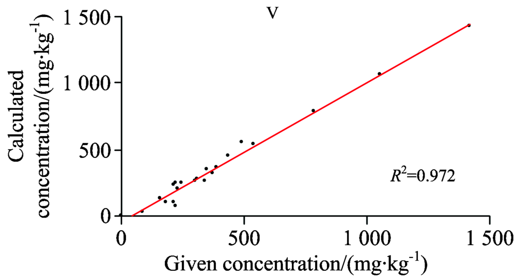 任意选取一个绿松石样品按测试条件重复测试5次, 计算各元素的平均值(Average)、 标准偏差, 获得其相对标准偏差(RSD)来检验该方法的精密度。 实验结果如表4所示, 其中Al, P, Cu, Fe和Zn元素的RSD均不超过1%, 精密度较高, V, Cr, K, Ca和Si元素的RSD在1.34%~10.17%之间。