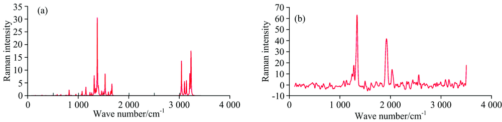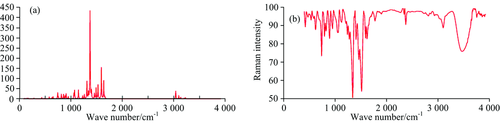 The C— C ring stretch in the precursor gives rise to several peaks in the region 1 600 to 1 400 cm-1 [19]. In the present study the frequency bands at 1 620, 1 373 cm-1 in IR spectrum are assigned to C— C stretching vibration mode. The theoretical computed wave number also present consisted agreement with experimental result. The ring breathing mode is calculated at 918 and 1 099 cm-1 and is observed in FTIR spectra 1 064 and 892 cm-1.