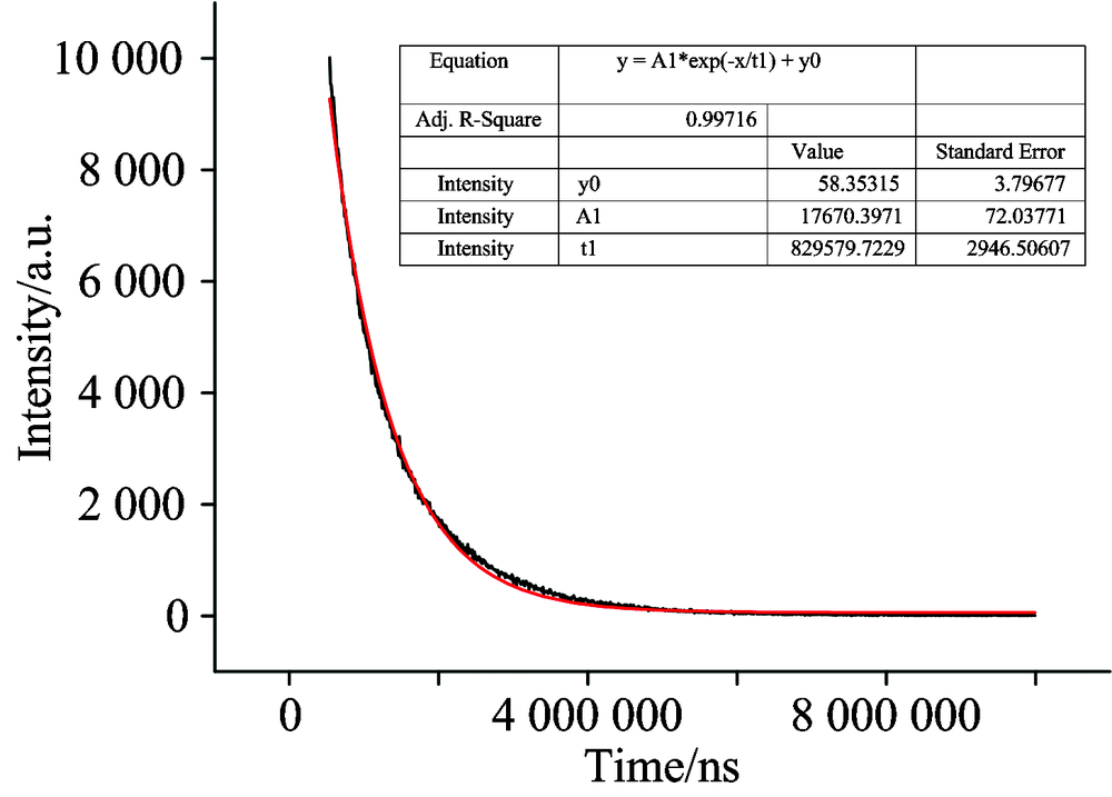 使用FLPS-920研究级荧光光谱仪在310 nm氙灯激发下, 测定Eu3+螯合物溶液(c=2.5× 10-5 mol· L-1)的荧光寿命。
