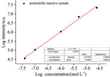 两种反应体系所得梯度稀释的Eu3+螯合物溶液的发射光谱, 如图2和图3所示。 在激发波长为330 nm时, 选取发射峰611 nm处的荧光强度进行分析比较, 如表1所示, 应用双对数函数模型和线性拟合进行分析比较, 如图4— 图6所示。 从图中可知, 两种反应体系中Eu3+螯合物溶液的荧光强度与Eu3+浓度在10-8~10-5范围内呈线性变化, 相关系数分别为0.993 73和0.986 65。 在相同浓度下, 乙腈反应体系所得Eu3+螯合物的荧光强度稍高于甲醇反应体系。