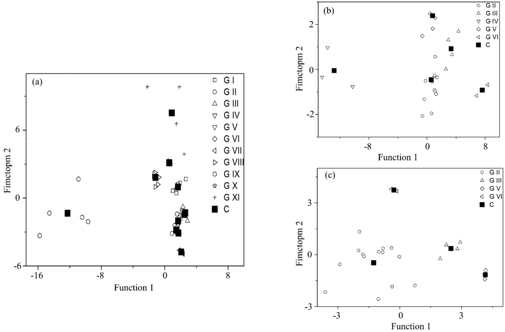 为了对柴油、 煤油、 航煤、 溶剂油、 汽轮机油进行更为准确的分类, 选取1 136~976与837~400 cm-1范围内的数据分别经过PCA-DA处理。 如图5(b)所示, 在1 136~976 cm-1波数范围内, 航煤与其他ILs差异明显, 可将其区分出来。 通过判别函数预测, 25个观测值中23个分类正确, 2个被判错, 交叉验证准确率为23/25=92%。 2个判错的观测值集中于柴油中。 如图5(c)所示, 在837~400 cm-1指纹区, 其余四种ILs聚类倾向明显, 不存在重合区域。 通过判别函数预测, 交叉验证准确率为100%。