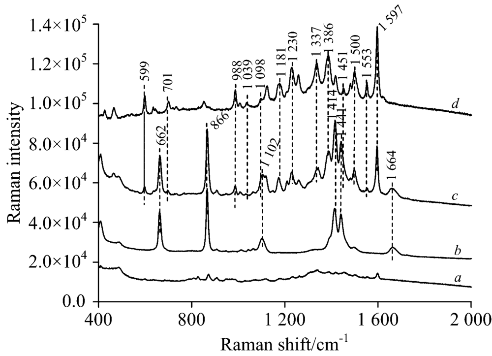 从图5b可以看出薄层板银溶胶的背景光谱有6个拉曼峰分别是662, 866, 1 102, 1 411, 1 441和1 664 cm-1, 这些拉曼峰来自银溶胶中溶剂DMF。 实际检测时, 待测物的拉曼光谱谱中仍存在这些背景峰, 但这并未影响待测物本身的拉曼信号。 从图5c和d可以看出SERS光谱中拉曼信号峰基本上是背景拉曼峰和酸性橙Ⅱ 拉曼峰的叠加, 再将其与图5a对比可以看出, 与同浓度的常规拉曼光谱相比, 表面增强拉慢光谱中酸性橙Ⅱ 大部分拉曼特征峰都能够在混合光谱中显现, 且信号强度有显著增强, 增强后的酸性橙Ⅱ 特征峰没有像碱性橙Ⅱ 一样发生大幅波数偏移, 各个拉曼峰增强效果也比较均匀。 从中可以清晰看到酸性橙Ⅱ 特征峰: 599, 701, 988, 1 181, 1 230, 1 337, 1 386, 1 500, 1 553和1 597 cm-1, 其中1 597 cm-1特征是所有特征峰中相对强度最强的。 此外988, 1 230, 1 337和1 597 cm-1这四个分散特征峰在光谱中能够清晰辨别出来, 信号强度较高, 也无背景信号干扰, 可以作为酸性橙Ⅱ 表面增强拉曼检测特征峰。