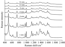 从图6可以看出, 在聚集剂和未浓缩水相银溶胶滴加后, 碱性橙Ⅱ 拉曼信号强度是一个逐渐减弱的过程。 在滴加1 min后, 拉曼信号增强效果最好。 随着时间的延长, 拉曼信号强度逐渐减弱, 8 min后拉曼信号强度也趋于不变。 银溶胶滴加后, 大量的水在薄层色谱板表面形成一个薄的水膜, 沉积在薄层板内的碱性橙Ⅱ 分子重新溶解并吸附在银粒子表面, 和银纳米粒子一起悬浮于水膜里, 此时检测能获得高信号强度拉曼光谱。 随着水分的挥发, 水膜逐渐变薄消失, 水中基底与碱性橙Ⅱ 分子接触机会减小, 单位基底吸附的碱性橙Ⅱ 分子减少, 拉曼信号增强效果逐渐减弱, 待水分挥发完全, 检测体系变为干斑, 拉曼信号则趋于稳定。