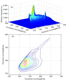 实验主要采用三维荧光光谱分析法, 是一种三维的立体荧光矩阵。 光谱曲线图中X轴代表该物质荧光的发射波长, Y轴代表该物质荧光的激发波长, Z轴代表对应的荧光光谱的强度。 该荧光光谱图主要描述了物质荧光强度随发射波长和激发波长变化的三维变化关系。 通过该三维图, 可以直观的看出不同物质的荧光特征峰的高度、 峰面积、 峰位置和峰斜度等荧光信息。 而等高图则是三维荧光光谱的另外一种表达方式, 该表示方式是用线将荧光强度相等的点连接起来, 从而形成一个在以发射波长为X轴、 激发波长为Y轴的二维平面上的闭合曲线, 该闭合等高曲线的内层代表荧光光谱特征峰所在的位置, 曲线由内向外, 代表对应荧光强度的逐渐减小。 较之二维的荧光光谱, 三维荧光光谱具有选择性好、 灵敏度高、 重现性更好的优点, 并且在光谱重叠的情况下可以进行多组分的分析。