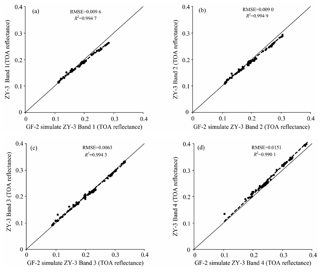 | 图3 基于试验影像建立的GF-2 PMS2和ZY-3 MUX转换方程的拟合结果Fig.3 Comparison of TOA reflectance between corresponding bands of ZY-3 MUX and simulated GF-2 PMS2 sensors |