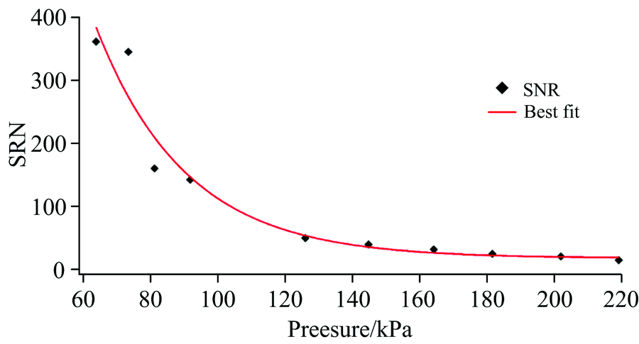 在激光强度I0、 激光发射中心波长Δ ν 、 进气样气干燥后含水浓度X、 吸收池吸收光程L、 吸收池温度T等参数不变的情况下, 不同压力下吸收得到的5个2f信号依次做平均之后, 如图5所示, 咱原始进气压力下(p=219.3 kPa), 吸收2f信号峰型较为平坦, 无明显谷-峰区别, 且可以看到信号线上噪音波动较大, 信噪比SNR较小。 随着压力的降低, 可以看到吸收2f信号是随着压力的降低, 吸收线性越来越高, 峰型越来越好。 甚至可以在左边区分出了一个个叠加的小峰。 将不同压力下采集的2f信号曲线, 通过计算每一压力下2f曲线上信号的幅值与噪声的幅值的比值, 即可相应得到不同压力条件下的SNR信噪比数值, 如图6所示, 可以看到, 随着压力的降低, SNR数值不断提升。