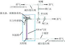 基于TDLAS的气体浓度检测基本原理, 分析了影响吸收线形的几种因素, 并提出了一种在不改变吸收光程的条件下, 利用靠大流量扫气通过喷管产生高速微喷射流从而产生低压区抽吸吸收池降低其压力的方法, 优化了痕量气体的吸收信号, 大大提高低浓度下测试信号的信噪比, 将系统测试灵敏度提升了将近一个数量级。 实验中将含水65 μ mol· mol-1的待测样气的进气压力由219.3 kPa降至63.9 kPa, 测试信噪比SNR提高了24倍, 测量误差则由4.43%降至0.71%, 探测灵敏度提升了一个数量级, 测量精度提高了6.3倍。 极大提高了TDLAS测量系统精度和测试稳定度, 对于工业上高精度、 高稳定性测量具有重要借鉴意义。