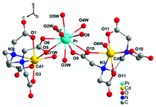 化合物1属于单斜晶系的C2空间群。 其不对称单元含有1.5个晶体学上独立的Cd2+, 1个Pr3+, 1.5个EDTA4-配离子, 5.5个配位水分子和7个游离的水分子(图1)。 其结构中2种Cd2+的配位数都是7, 采取单帽三棱柱配位构型, 分别与来自于1个EDTA4-配体的2个N原子和4个羧基