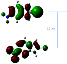 分子中的前线轨道即最高占据轨道(highest occupied molecular orbital, HOMO)和最低空轨道(lowest unoccupied molecular orbital, LUMO)可以提供分子的电子吸收光谱性质、 化学亲电亲核性能等重要的分子信息。 MNBMZ分子的前线轨道见图4。 HOMO和LUMO轨道能级分别为-6.37和-3.06 eV, 能级差为3.31 eV, 电子有从HOMO跃迁到LUMO的趋势。 HOMO轨道中S原子的贡献是52.53%, LUMO轨道中硝基N和O原子的贡献分别为23.03%, 19.97%和19.36%[19]。