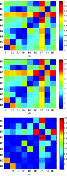| 图3 3种指数与样品含水量相关系数示意图(a): RTI; (b): NDTI; (c): DTIFig.3 The correlation distribution between three indexes and sample moisture content at different wavebands(a): RTI; (b): NDTI; (c): DTI |