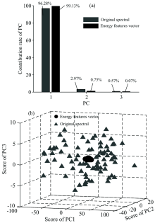 根据EF计算公式, 每个尺度提取一个EF, 最终每个样本形成10维EFV。 主成分分析法(PCA)可有效降低数据维度, 以少数几个主成分变量反映原始信息。 在本工作中, PCA用于分析土壤高光谱和EFV的第一主成分贡献率及前三个主成分得分的空间离散程度, 判断EF转换前后变量的主成分信息变化趋势。 EFV的第一主成分贡献率为99.13%, 比原始光谱的第一主成分贡献率高出3%[图4(a)], 接近于100%, 表明EFV第一主成分所包含的信息量较土壤高光谱有所增加, 且具有极强的信息代表性。 前三个主成分得分所建立的三维散点图[图4(b)]更为形象地表明EFV的降维效果, 原始光谱各样本主成分得分散点分布广泛, 样本间差异显著, 主成分所含信息分散; EFV各主成分得分散点十分聚集, 表明噪声消除后样本间差异降低。 通过PCA分析, EFV在降低光谱数据维度、 消减光谱噪声的同时提高了样本变量信息贡献率。