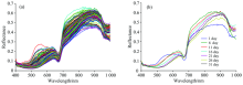 采集长枣图像信息, 利用ENVI 4.6提取长枣感兴趣区域, 分别从枣赤道部位提取椭圆大小为25 mm× 15 mm的ROI, 计算出平均反射光谱作为原始光谱, 如图2(a)所示。 将平均光谱再均值化, 得到图2(b)所示的长枣贮藏期的原始平均光谱, 由图2(b)可看出, 在675 nm附近, 光谱反射值达到峰谷, 是由于长枣样本的C— H伸缩振动引起的[11], 900~1 000 nm波段间的吸收峰是由于长枣内部水分中O— H基团的二倍频特征吸收[12]所引起的。