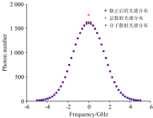 其中, Nx为第x个阵列上的能量大小, p的取值范围为0~1。 修正后的信号如图5所示(p=0.5), 其中红色“ × ” 号表示分子散射和气溶胶散射的总散射光谱, 蓝色“ · ” 号表示分子散射光谱, 黑色“ +” 号表示修正后的光谱分布, 从图中可以看出, 利用上述方法可以减小气溶胶散射信号对RB散射光谱测量的影响。