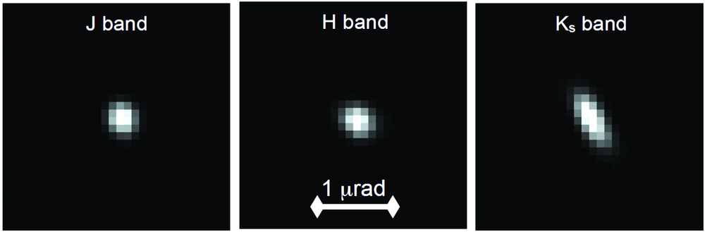 2015年, Hart等用6.5 m多镜望远镜对GEO轨道大型通信卫星Anik F2进行了测光观测, 获取了其在J, H, Ks三个近红外波段的图像[14]。 观测中应用了自适应光学手段, 提高了解析能力, 使视场中的目标成为具有低分辨率的亮斑。 其中, 太阳帆板在长波段Ks具有较高的反射能量, 得以显现, 如图2所示。 作者指出, 卫星帆板在可见光段通常不可见, 而红外成像观测必须采用大口径望远镜。