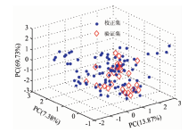 对预处理后的近红外光谱进行主成分分析, 第一、 第二和第三主成分的贡献率分别为69.73%、 13.87%和7.38%, 前三个主成分的累积贡献率达90.98%。 校正集和验证集的三维主成分空间分布情况如图1所示。