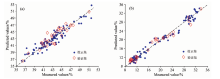 | 图4 纤维素和半纤维素实测值与预测值分布 (a): 纤维素; (b): 半纤维素Fig.4 Distribution of measured and predicted values for cellulose and hemicellulose (a): Cellulose; (b): Hemicellulose |