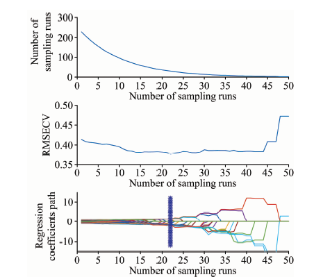 The results for variable selection for wheat diseases using the CARS method are shown in Figure 5. Under the action of the exponential decay function, the rate of decrease of variable number became slower with the increase in running times, indicating the stages of roughing and handpicking of the CARS algorithm for key variable selection. The RMSECV value first decreased and then increased, with the smallest RMSECV value at the sampling frequency of 22, which suggested that information variables irrelevant to wheat disease information were eliminated in steps 1~22. As shown in Figure 5, the selected spectral variable subset was optimal at the sampling frequency of 22, which contained 30 spectral variables.