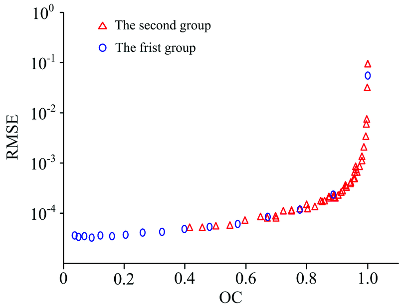 经过多种尝试和计算, 提出重叠系数(overlapping coefficient, OC), 此参数与RMSE成单调关系。 重叠系数OC的定义如下: