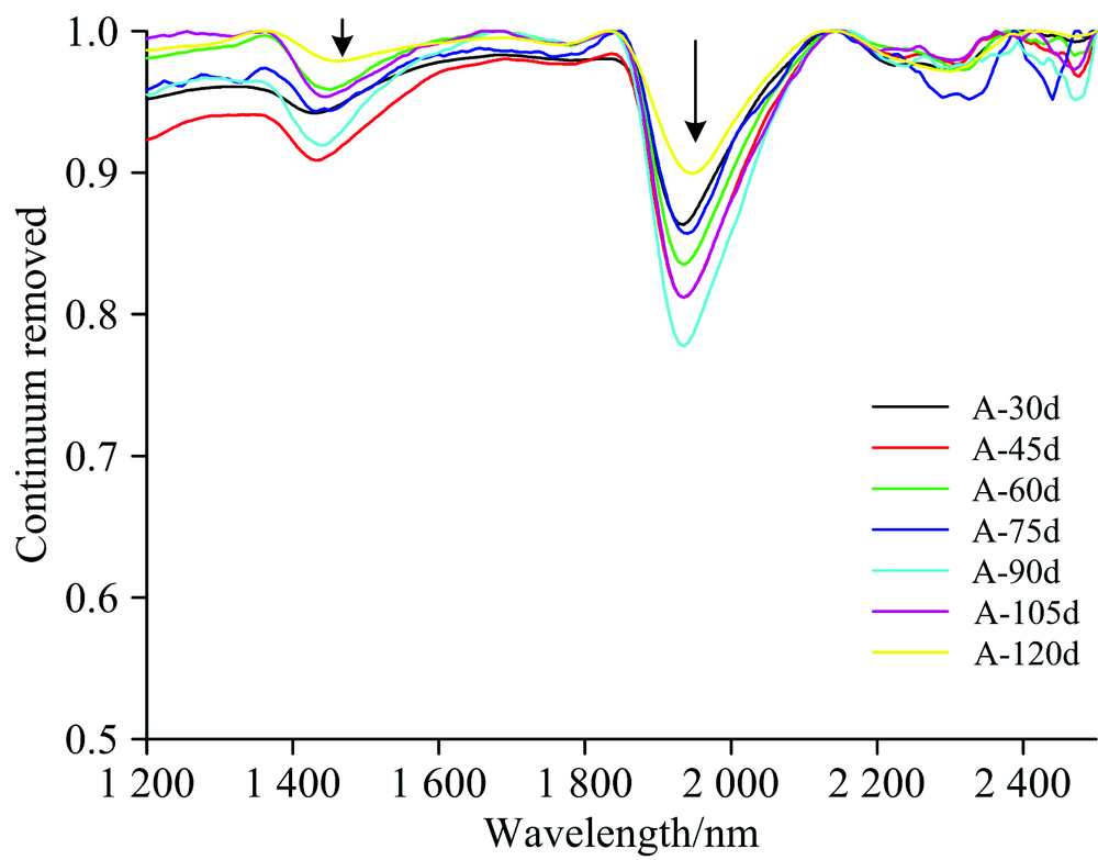 图1、 图2分别为A组、 B组混凝土各龄期去除包络线后的光谱曲线。 混凝土光谱曲线是组成混凝土各种物质光谱曲线的复杂叠加, 每种典型物质波谱吸收谷都会在混凝土光谱曲线中体现。 从图中可以看出, A组与B组光谱曲线整体走势相近, 在近红外波段(1 200~2 500 nm)吸收位置相近, 两组曲线均在1 445和1 945 nm附近体现较强吸收特征, 在1 780 nm附近存在弱吸收, 并且B组混凝土的吸收深度明显大于A组。