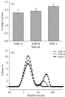 用MF-A, MF-B和MF-C三种乳脂肪分别按本文1.2中方法制成稀奶油, 分别标记为XMF-A, XMF-B和XMF-C后对其粒径进行分析, 结果见图7。