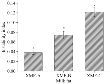 三种稀奶油失稳系数顺序为XMF-A< XMF-B< XMF-C(p< 0.05)(图9), 数值越小, 表明样品越稳定, 体系稳定性顺序为XMF-A> XMF-B> XMF-C(p< 0.05)。