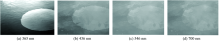 为验证自然光下开阔的人工湖面上漂浮汽油、 二甲苯在不同光谱反射率波段的成像效果, 使用紫外可见光谱相机获取365 nm(紫外)、 436 nm(蓝)、 546 nm(绿)以及700 nm(红)四个波段的图像, 并进行比较。 在这四个波段下湖面漂浮汽油与二甲苯的成像效果分别见图3与图4。
