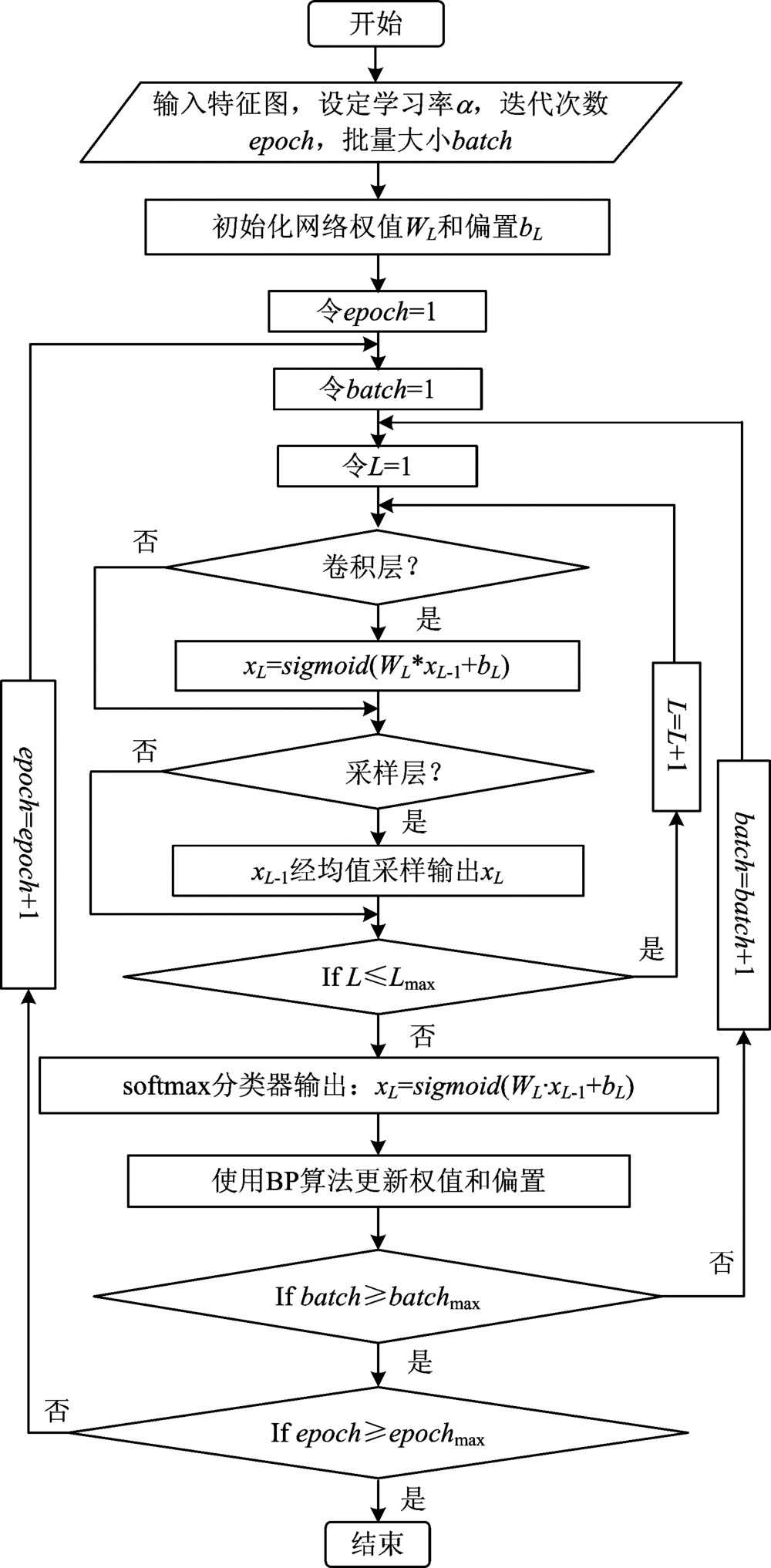 首先, 设定网络的训练参数, 初始化网络的权值和偏置, 输入特征图经过卷积层、 采样层、 全连接层处理后, 传输至输出层, 每一层的输出为下一层的输入; 然后, 将实际输出与期望输出间的误差通过BP算法逐层反向传播, 并将误差分配到各层, 对网络的权值和偏置进行调整, 直至满足收敛条件, 以实现网络的有监督训练。