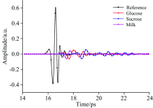 图2为参考信号和葡萄糖、 蔗糖及奶粉(压片厚度分别为0.89, 0.72和0.83 mm)纯品样品的太赫兹时域信号, 从图中可看出, 与参考信号相比, 经过葡萄糖、 蔗糖及奶粉样品压片的太赫兹时域信号在时间和幅值上均呈现出一定的延迟和衰减现象, 产生延迟的原因是样品的折射率大于空气折射率, 而衰减则是由样品表面的反射及内部的吸收引起的[10]。