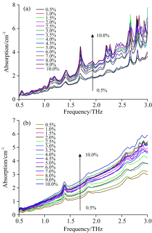 在相同的实验条件下, 分别获取不同浓度的葡萄糖-奶粉混合物、 蔗糖-奶粉混合物的太赫兹时域光谱信号, 并计算得到两种混合物的吸收系数谱和折射率谱。 由吸收系数谱图4可知, 混合物的整体吸收峰位置与葡萄糖、 蔗糖纯品吸收峰位置一致, 具有稳定的吸收特性, 且随着混合物中葡萄糖、 蔗糖含量的增加, 吸收峰值也逐渐增大, 因此可通过两者之间的相关特性建立定量分析模型。 由折射率谱图5可知, 混合物的折射率幅值随着混合物中葡萄糖、 蔗糖含量的增加呈现上移的趋势, 故通过折射率谱也可对混合物中葡萄糖、 蔗糖含量进行定量分析。