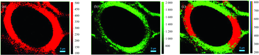 采用显微共聚焦拉曼光谱(HR Evolution, Horiba Jobin Yvon)进行光谱采集和成像。 为获得较高的空间分辨率, 光谱采集时采用100倍油镜(MPlan100× , Oil, NA=1.25)以及532 nm激发波长, 激光功率为8 mW。 测试时光栅为300 mm-1, 狭缝宽度为100 μ m, 扫描步距0.5 μ m, 单点光谱采集时间1 s, 光谱测定范围500~3 100 cm-1, 光谱分辨率2 cm-1, 最后利用LabSpec6软件对获得数据进行后期处理, 光谱特征峰比值通过峰面积比值计算获得。