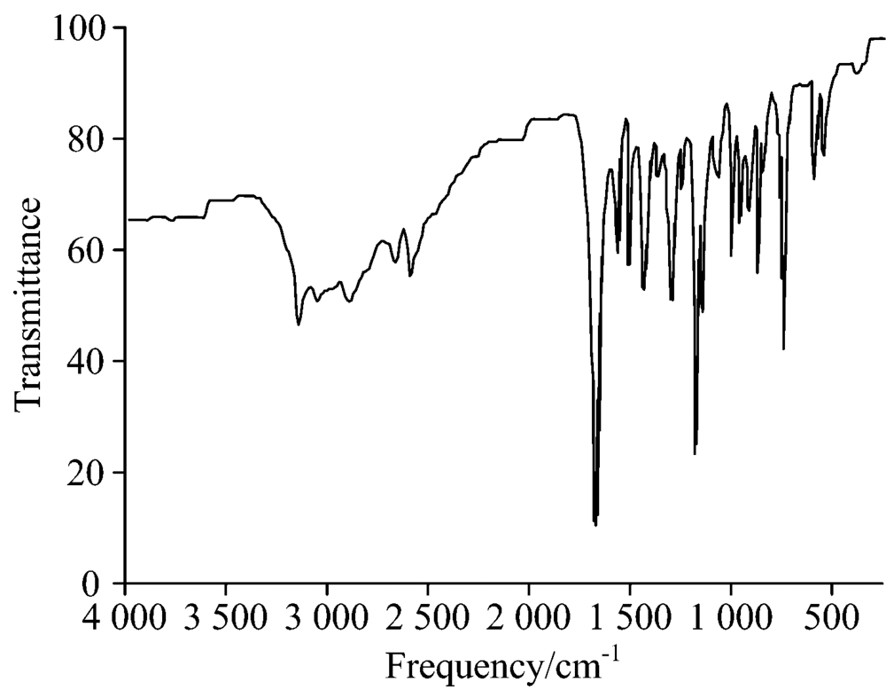 呋喃甲酸的晶体结构表明晶胞中分子都是平行排列的, 每个分子都被其他分子所包围, 不可避免要受到分子间作用力影响, 当样品经研磨与KBr形成压片时, 原先的有序结构将被破坏, 会形成各种分子聚集体, 但由于以氢键结合的二聚体比较牢靠, 故该构型将会是占优势的存在形式, 所以我们通过二聚体之间存在的作用力模拟其他分子对红外光谱的影响。 二聚体中两个羟基应具有相同的振动频率及相同的对称性, 具备了费米共振的条件, 使得振动频率发生分裂, 在非谐振子模型下M06-2X泛函计算的O— H伸缩振动位于3 180以及2 948 cm-1处, 而实验值为3 210及2 901 cm-1, 误差分别为30以及47 cm-1, 羰基的伸缩振动频率实验值为1 675 cm-1, 而M06-2X得到的非谐振频率为1 691 cm-1, 吻合得很好, 图7为M06-2X计算得到的二聚体非谐性IR光谱, 图8为固态呋喃甲酸的实验红外光谱, 两者在500~2 000 cm-1范围内不管是红外光谱的强度还是振动频率都较为吻合, 但羟基的透光率计算值与实验值相差较大, 这是由于量子化学对于弱相互作用的计算缺乏合适的参数、 普适的力场、 合理的色散校正项等因素, 使得计算精度较差造成的, 另外实际固体物质存在的方式多样, 除了此处的的二聚体外, 还存在其他二聚体及多聚体, 这些因素也使计算结果出现偏差; 图7, 图8在2 000~3 000 cm-1之间有一些吸收峰, 这应该是各种泛频、 合频峰, 二聚体部分泛频谱数据见附表6。 经计算振动量子数对应的0→ 2红外跃迁的倍频吸收峰强度很小, 没有超过1.0 km· mol-1的, 而基频之间形成的合频是造成这些峰的主因, 如3 190.5 cm-1的峰是1 506.4 cm-1(呋喃环的变形振动)及1 691.1 cm-1(羰基伸缩振动)的和频造成的, 对应强度为45.26 km· mol-1, 2 851.5 cm-1的峰是1 435.2 cm-1(羟基氢的面内摇摆)及1 424.3 cm-1(羟基氢的面内摇摆)的和频造成的, 对应强度为114.18 km· mol-1, 2 730.3 cm-1的峰是1 435.2 cm-1(羟基氢的面内摇摆)及1 301.1 cm-1 (羟基氢的反对称面内摇摆)的和频造成的, 对应强度为60.98 km· mol-1, 2 673 cm-1的峰是1 375.2 cm-1(呋喃环上的氢摇摆振动)及1 309.1 cm-1(羟基氢的反对称面内摇摆)的和频造成的, 对应强度为37.55 km· mol-1, 2 612 cm-1的峰是1 308.2 cm-1(羟基氢的反对称面内摇摆)及1 309.1 cm-1(羟基氢的反对称面内摇摆)的和频造成的, 对应强度为40.90 km· mol-1。 由于二聚体分子间是通过氢键而不是化学键结合的, 其刚性降低, 非谐性因素增大, 与之相关的合频峰的强度也随之增大, 在单体中不太明显的这些峰在二聚体中已很明显, 与实验谱图较为吻合。