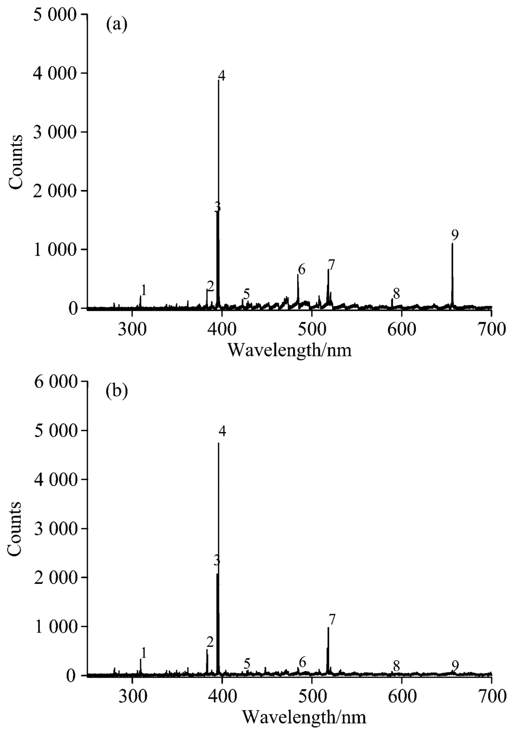 | 图2 激光诱导等离子体光谱图 (a): 氧化膜; (b): 铝合金基体Fig.2 Laser induced plasma spectroscopy (a): Oxide film; (b): Aluminum alloy substrate |