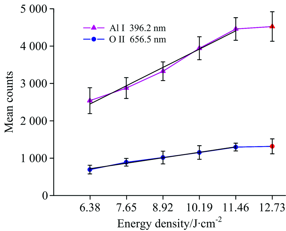 然而线性规律在能量密度大于11.46 J· cm-2时不再成立, 当能量密度上升至12.73 J· cm-2时, Al元素原子谱线强度未出现符合之前线性关系的明显提升。 当能量密度为11.46 J· cm-2时, 光斑直径内氧化膜层已基本去除, 增大相应能量密度不会烧蚀对应量的Al2O3, 存在部分激光能量作用于铝合金基体的可能。 此时式(3)不再适用, 谱线强度不再呈线性增强。 656.5 nm处O元素离子谱线强度具有与Al元素原子谱线强度基本一致的变化。 Al和O元素谱线强度变化说明了过高的激光能量密度存在损伤基体的可能。